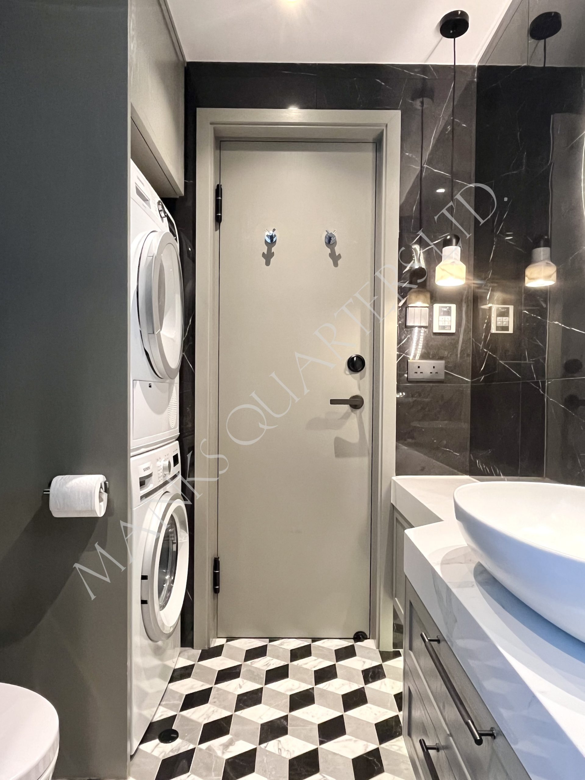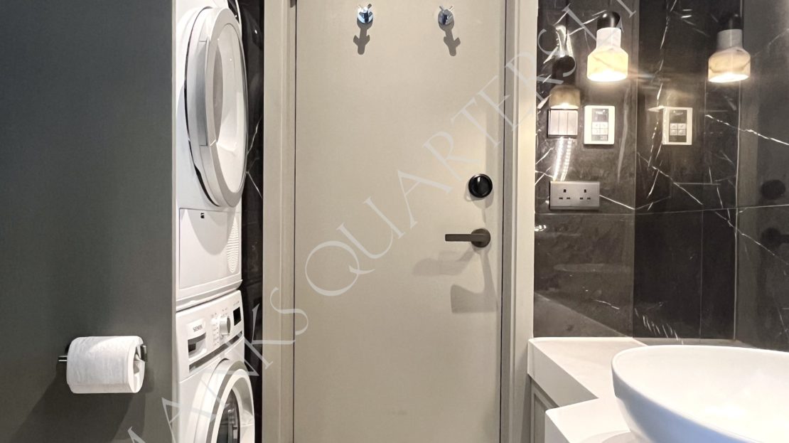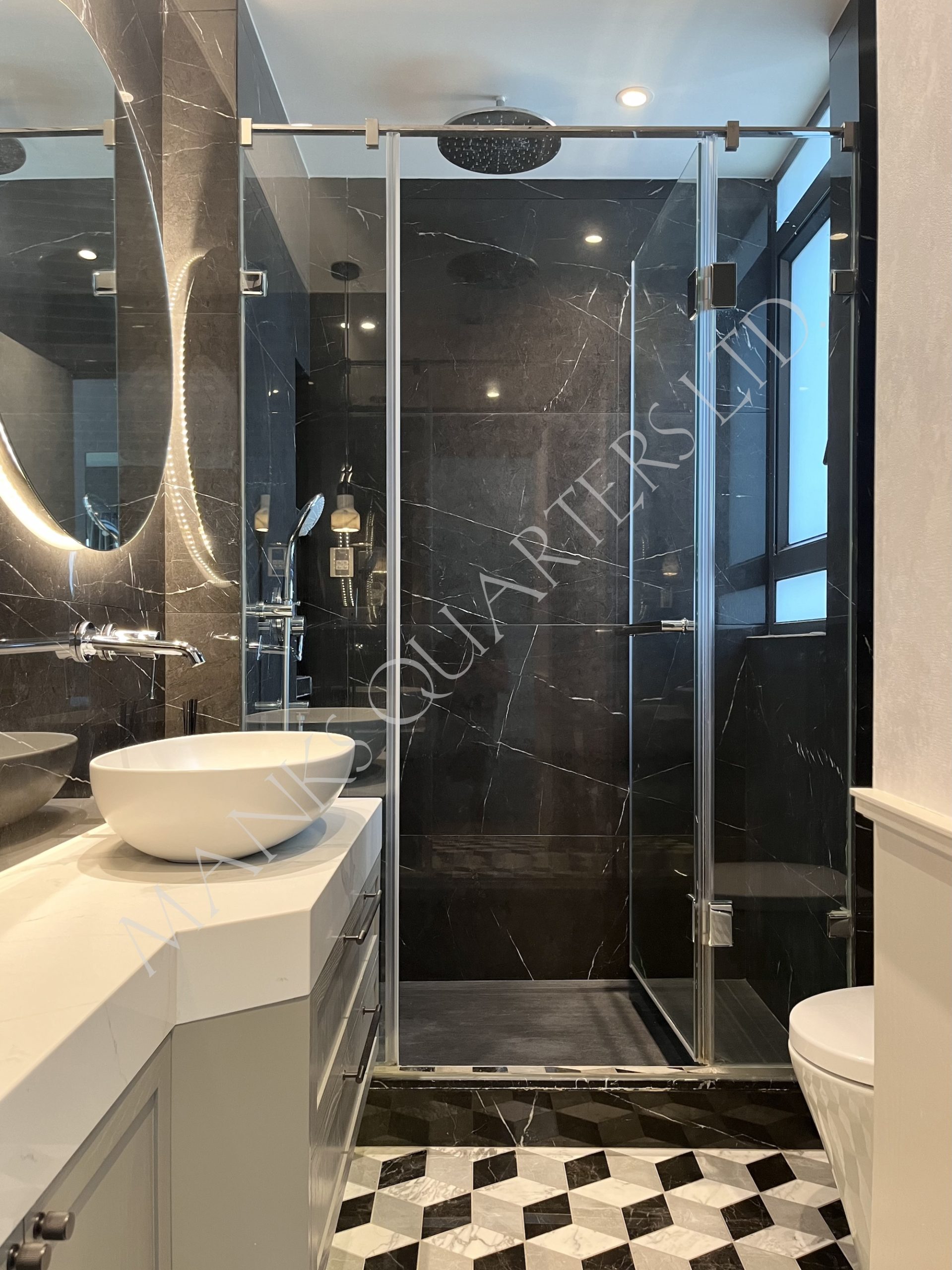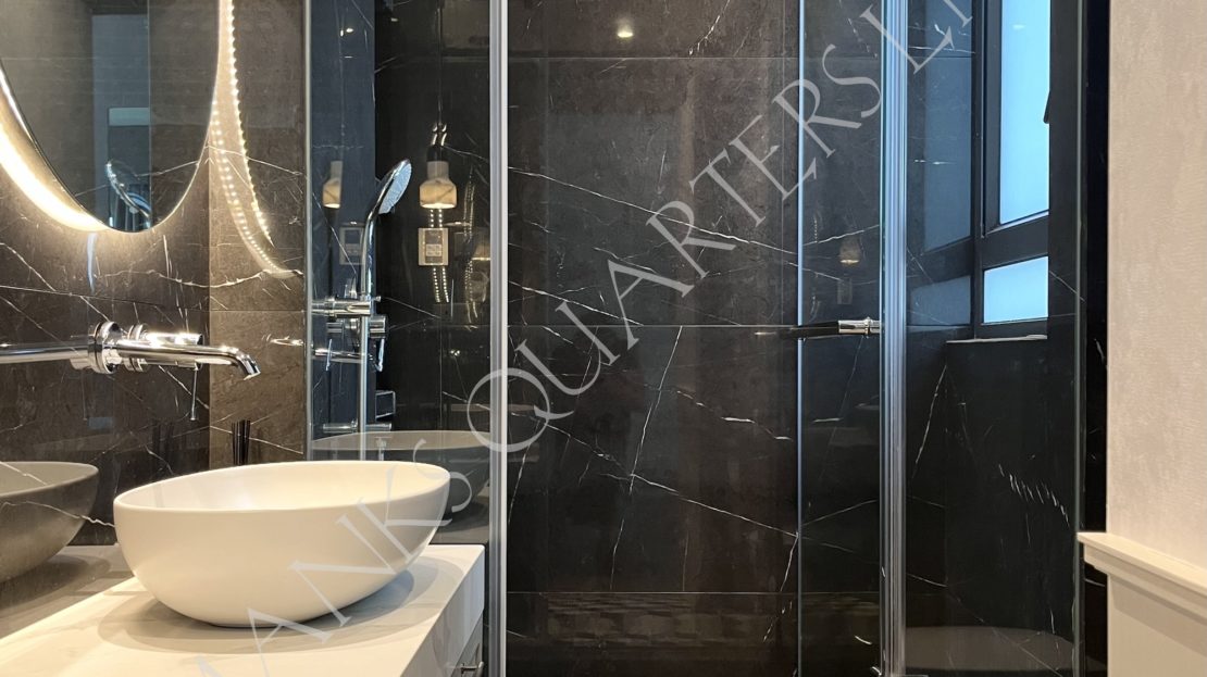 - Marble-lined bathroom with rain shower